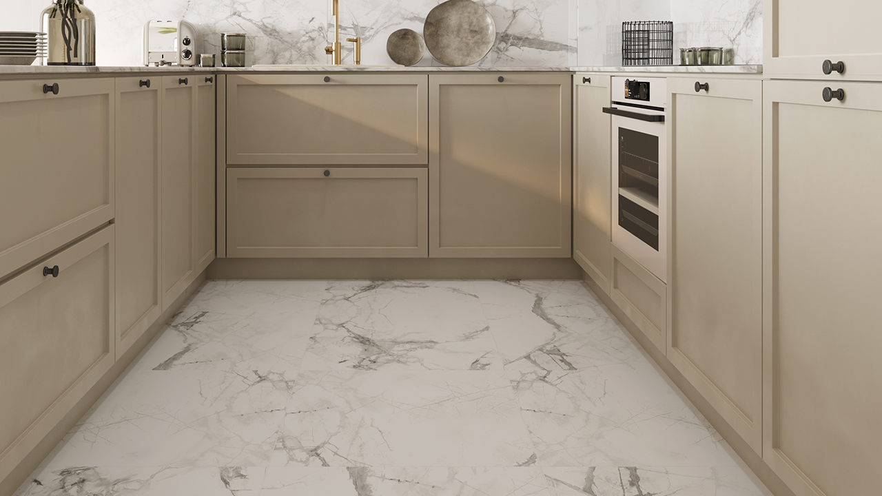 Stone Plastic Composite Technologie macht den Boden vollständig wasserdicht - ideal für Küchen, Bäder und Feuchträume.