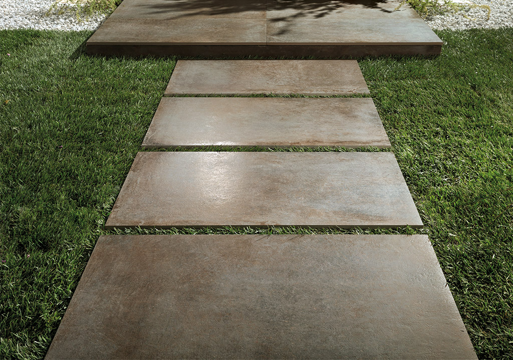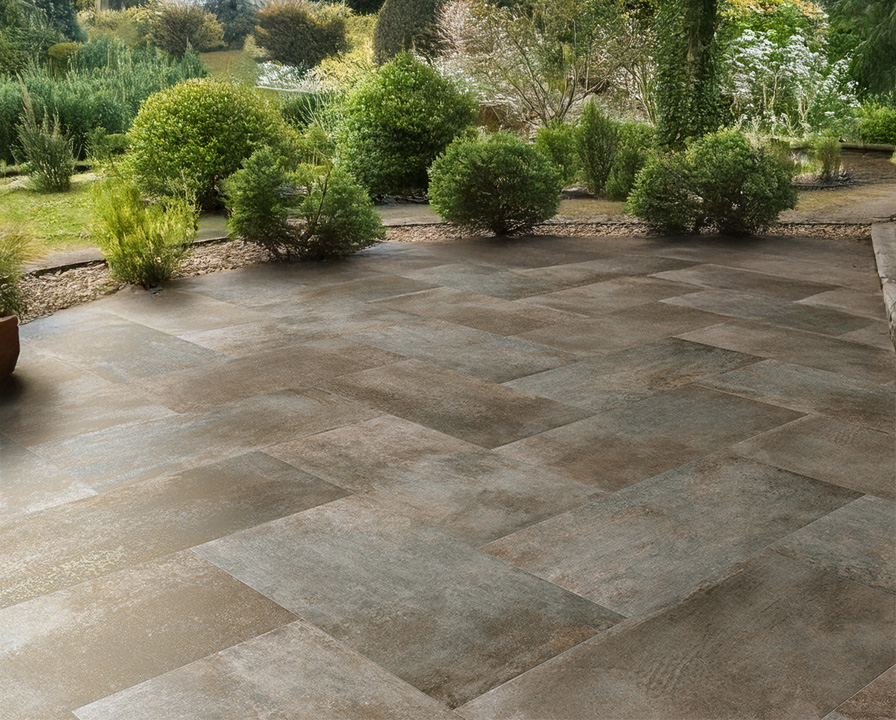 Metalloptik in Feinsteinzeug - für moderne Terrassen mit Charakter. Oxidierte Metalle gehören heute zu den beliebtesten Materialien in der modernen Architektur. Genau davon inspiriert, vereint diese exklusive Kollektion den industriellen Look von Stahlplatten mit den technischen Vorteilen von hochwertigem Feinsteinzeug - ideal für den Einsatz im Außenbereich.